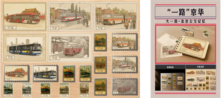 设计说明:本作品以北京公交大一路的历史车型为主题,设计了明信片、邮票、冰箱贴与活页笔记本等系列文创。大一路是北京最具代表性的线路之一,见证了城市交通的发展与时代的变迁,作品通过插画形式再现不同时期的公交车型,结合复古邮票边框与明信片排版,让人们在使用和收藏中重温独特的城市记忆。整体视觉延续复古插画风格,既体现老北京的厚重人文底蕴,也呼应新时代的现代设计感,作品以日常公共交通为切入点,将市井烟火与历史文化结合,它既展现了北京三千年建城史与八百年建都史背景下的厚重文化底蕴,也体现了新时代首都的开放、活力与亲和力。通过这一系列文创,观者得以在细节中感受到“最”北京的独特魅力与人文温度。