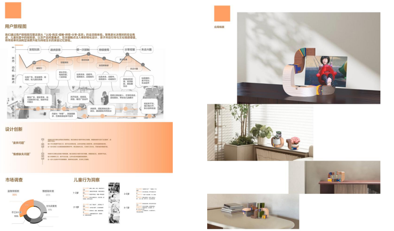 设计说明:以故官传统纹样为灵感,将文化元素融入儿童拼插积木中。作品采用木质效果与开口贾通榫结构,保证拼装稳固与操作安全,让孩子在动手中直观感受中国传统工艺之美。与一般玩具不同,本产品具有功能转换特性:在儿童不再使用为玩具时,积木可重新拼插组合为书立、相片框、盆栽架或钥匙挂钩等日常物品,实现从“玩“到“用”的转化。它不仅延长了产品生命周期,减少一次性消耗,也赋予了物件情感化与环保价值,通过故言纹样的视觉传递与场最转换的功能实践,作品既承载了传统文化教育意义,体现“最”北京主题文化;又体现了寓教于乐、绿色可持续的设计理念,成为连接童趣与生活的独特文创作品。