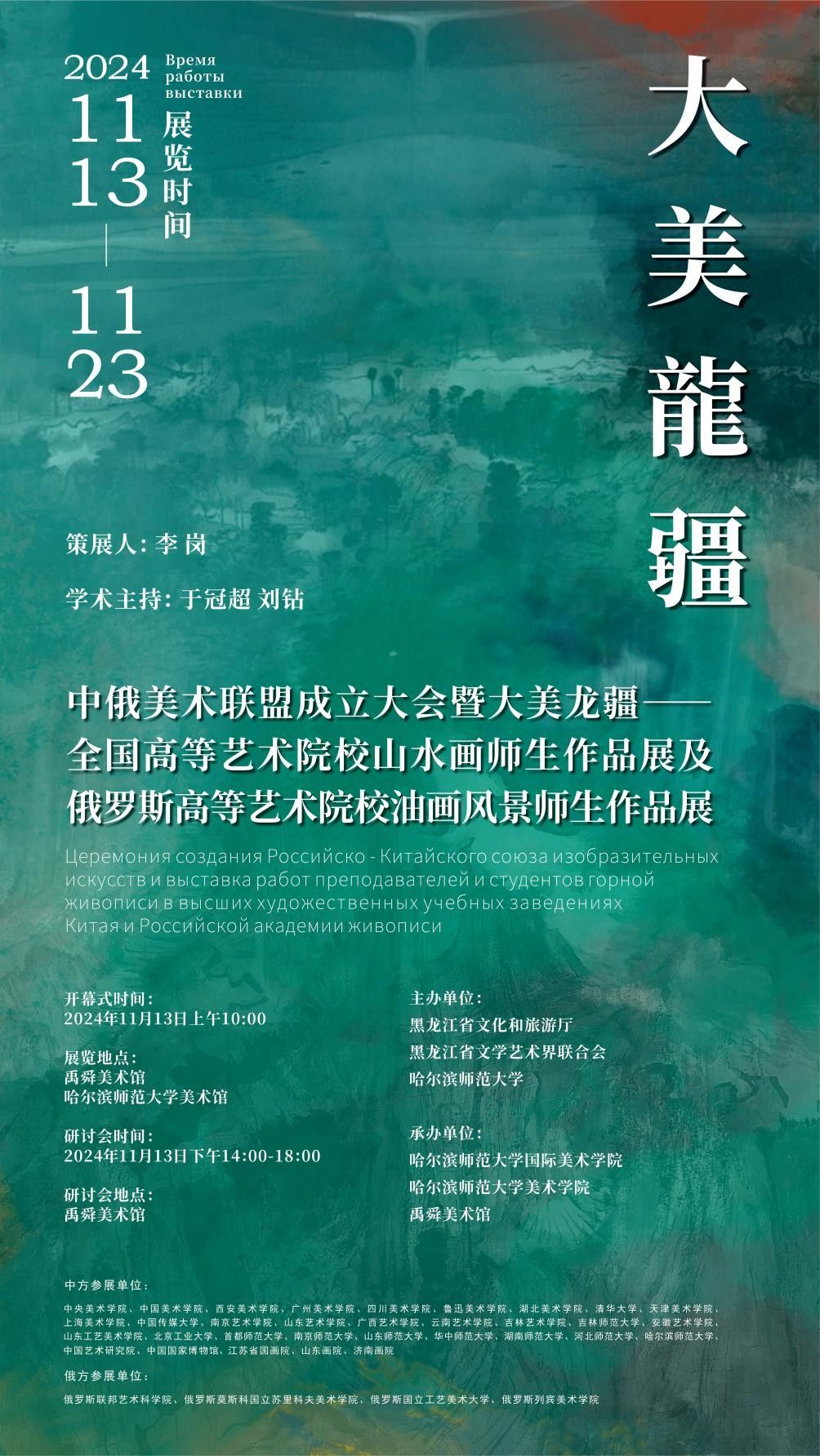 11月13日,“中俄美术联盟第一届全体代表大会暨大美龙疆——全国高等艺术院校山水画师生作品展及俄罗斯高等艺术院校油画风景师生作品展”在哈尔滨禹舜美术馆举办。“大美龙疆——全国高等艺术院校山水画师生作品展及俄罗斯高等艺术院校油画风景师生作品展”由黑龙江省文化和旅游厅、黑龙江省文学艺术界联合会、哈尔滨师范大学联合主办,哈尔滨师范大学国际美术公司、哈尔滨师范大学美术公司、禹舜美术馆承办。yl23455永利绘画系师生十二幅作品参加此次展览,集中展现了绘画系山水画教学的整体面貌,体现了山水与时代同行的教学理念。