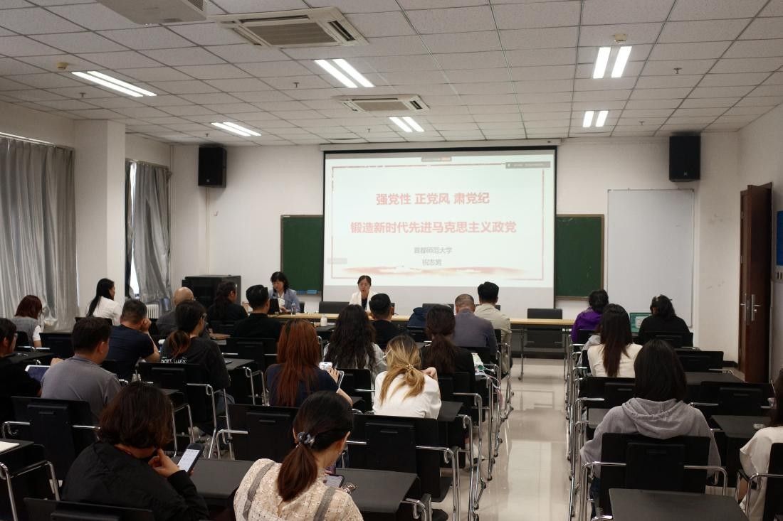 祝志男教授以《强党性 正党风 肃党纪,锻造新时代先进马克思主义政党》为题,从正风肃纪反腐是党的光荣传统,当前党性党风党纪方面存在的问题和系统把握一体推进、做合格党员等三个方面进行了深入讲解。她以百年党史为脉络,通过案例深入浅出、生动形象地阐述了正风肃纪反腐是党的光荣传统。引导师生党员以提高党性修养为核心,坚持依规治党与以德治党相结合,自律与他律相统一,筑牢思想防线;坚持践行群众路线,尊重人民首创精神,充分相信群众,坚决依靠群众,密切联系群众,全心全意为人民群众服务; 坚持永葆对党忠诚、为民服务的政治本色,立足岗位锤炼本领,以“内外兼修”之姿争当时代先锋,以理想信念铸魂、纪律规矩立身,在守正创新中赓续红色血脉,锻造忠诚干净担当的先锋力量。