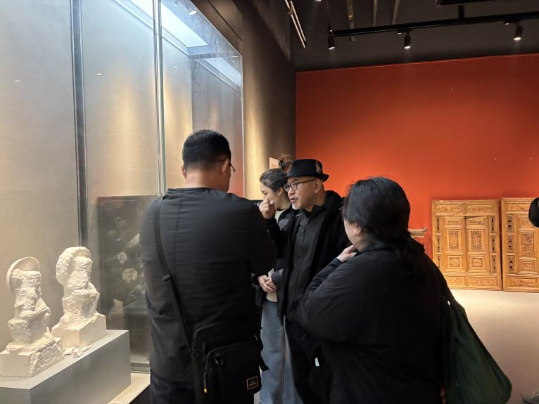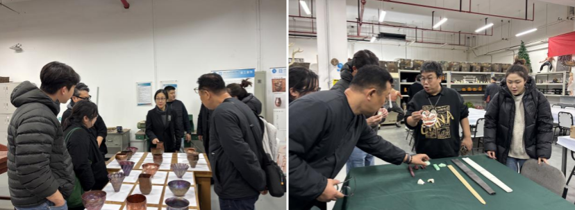 在金工实验室和大漆实验室,嘉宾们近距离观看了员工的金属工艺作品、大漆髹饰创作过程,不时与指导教师交流传统工艺的现代设计转化思路。当走进3D打印实验室时,韩方教授对公司先进的数字设计设备与跨学科实践项目表现出浓厚兴趣,双方就“数字技术+传统工艺”的创新应用展开深入探讨,分享各自在教学与科研中的经验做法。